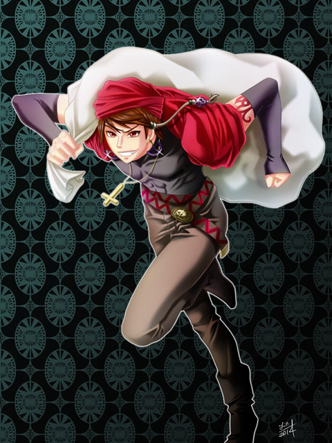 ![]() -------------------------------------------------------------------------------- 太古の昔、かつて地上にはメトゥスと呼ばれる種族がいた。姿は人間とよく似ていたが、彼らは人間よりも遙かに長い寿命、そして強い魔力を持ち、一部には奇跡と呼べる現象を起こせる者さえ存在した。やがてメトゥスは地上から去り、別の世界へと移り住んだが、メトゥスの間で主張の対立が起こった。法と秩序を重んじる者たち、力と自由を望む者たちの二つに分かれ、熾烈な戦いを始めた。その余波は地上にも大きな影響を及ぼし、人智を越えた力を操り、時に天変地異をも引き起こしたメトゥスを、地上に住む古代の人々は畏怖の念を込めて「天使」や「悪魔」などと呼び、やがてそれらは神話や伝説として語られていくこととなった。 「あーあ、つまんねえな」 木製の椅子に腰掛け、ブーツを履いたままの両脚をテーブルの上に投げ出し、彼は赤毛の前髪を指先で弄りながら不機嫌な顔を隠そうともせずに呟いた。彼――シュート・アンブロシアは、引き締まった体格に鋭い目つきを持つ若い男で、真っ赤なターバンと黒いシャツ、茶色のズボンを履き、肩からターバンとお揃いの赤いショールを羽織っている。アクセサリーに逆十字のネックレスと一対の半円型イヤリングを身に付け、それらは時折ランプの光を反射して、キラキラと光を放っていた。シュートは力と自由を望む「魔族」に属するメトゥスの一人で、十人ほどの部下を引き連れた盗賊の首領として、魔界各地を移動しながら暴れ回っていた。狙った獲物は決して逃がさず、刃向かう者に容赦はしない。『紅の盗賊』シュートと言えば、魔界の者達からも恐れられ、一目置かれる存在であった。 今回、魔界でも有数の都市『ハンニバル』に狙いを定めた彼らは、都市の郊外に程近い森の中に、おそらくかつては狩猟の際の山小屋にでも利用されていたのであろう廃屋を見つけると、そこを拠点に数度にわたって盗みを繰り返していた。木造の古びた仮の根城には、奪ってきたばかりの戦利品が山のように積まれている。金銀の財宝や宝石、美しい織物――そしてテーブルの上には、新鮮な食料や飲みきれないほどの酒が所狭しと並べられ、彼の手下達がそれらを夢中で口に運んでいる。しかしシュートは、今回もまた大成功となった成果を見つめながらも、何故かとても不機嫌な表情を浮かべていた。 「どうしたんだよお頭、浮かない顔しちまってさ。これだけのお宝があれば、当分は面白おかしく暮らせるんだぜ?」 大きなテーブルの向こうで、ワインをラッパ飲みしていた手下の一人がそう言った。シュートは手下を睨み付けると、テーブルに置かれていたナイフをいきなり投げつけた。ナイフはワインの瓶を貫いて粉々にすると、そのまま壁に突き刺さった。 「なっ、なにすんだ、危ねえだろッ!?」 飛び散ったワインで濡れた顔を手で拭いながら立ち上がり、シュートを睨み付けたが、逆に睨み返されて言葉を詰まらせる。 「最近じゃあ俺の名前も売れちまって、シュート・アンブロシアって名前を聞いただけで、ビビった相手が自分からお宝を差し出してきやがる。こんなんじゃ面白くもなんともねえんだよ」 シュートの言葉に、部下達は全員が困ったように顔を見合わせる。 「あーあ。有名になるのも考えモンだな。もっと刺激が欲しいぜ」 しばらくして、部下の一人が思い出したように顔を上げ、ポンと手を叩いて言った。 「そうだ、お頭」 「どうした? 何か思いついたのか?」 「それならバアルの城に忍び込むってのはどうだ?」 バアルという名前を聞いた途端、その場にいた全員が、口にしていた食べ物やワインを一気に吹き出し、口を揃えて叫んだ。 「おいおいおい!」 「お前、頭大丈夫か?」 「バ、バアルっておい、正気とは思えねぇぞ」 この魔界において、バアルの名を知らぬ者はいない。魔界を統治する最高権力者の一柱たる大物中の大物であり、このハンニバルをはじめ、いくつもの大都市を統べる存在である。各都市にはそれぞれの支配者がおり、彼らは貴族と呼ばれる支配階級であり、各々が支配する都市の法を独自に決めている。要するに強い者は自分の支配が及ぶ地域の中ではやりたい放題であり、魔界には全ての都市に共通した法などはないのである。 また、魔界においては『力』こそが絶対であり、高い地位にいる者は、すなわちそれに見合った実力の持ち主である。中でもバアルは、そうした魔界の貴族階級の中にあって、最高指導者ルシフェルに並ぶほどの力を持つとも言われているのだ。そのバアルの居城に忍び込もうなどというのは、考えることさえも愚かしい、まさに自殺行為である。バアルの居城はハンニバルの中心にあり、小高い山の上で街全体を見下ろすようにそびえ立っていた。 「確かにこの都市を統治しているのはバアルだ。城があるのもわかっちゃいるが、奴の寝床をつついてタダで済むとは思えねえぜ」 「ところがそうでも